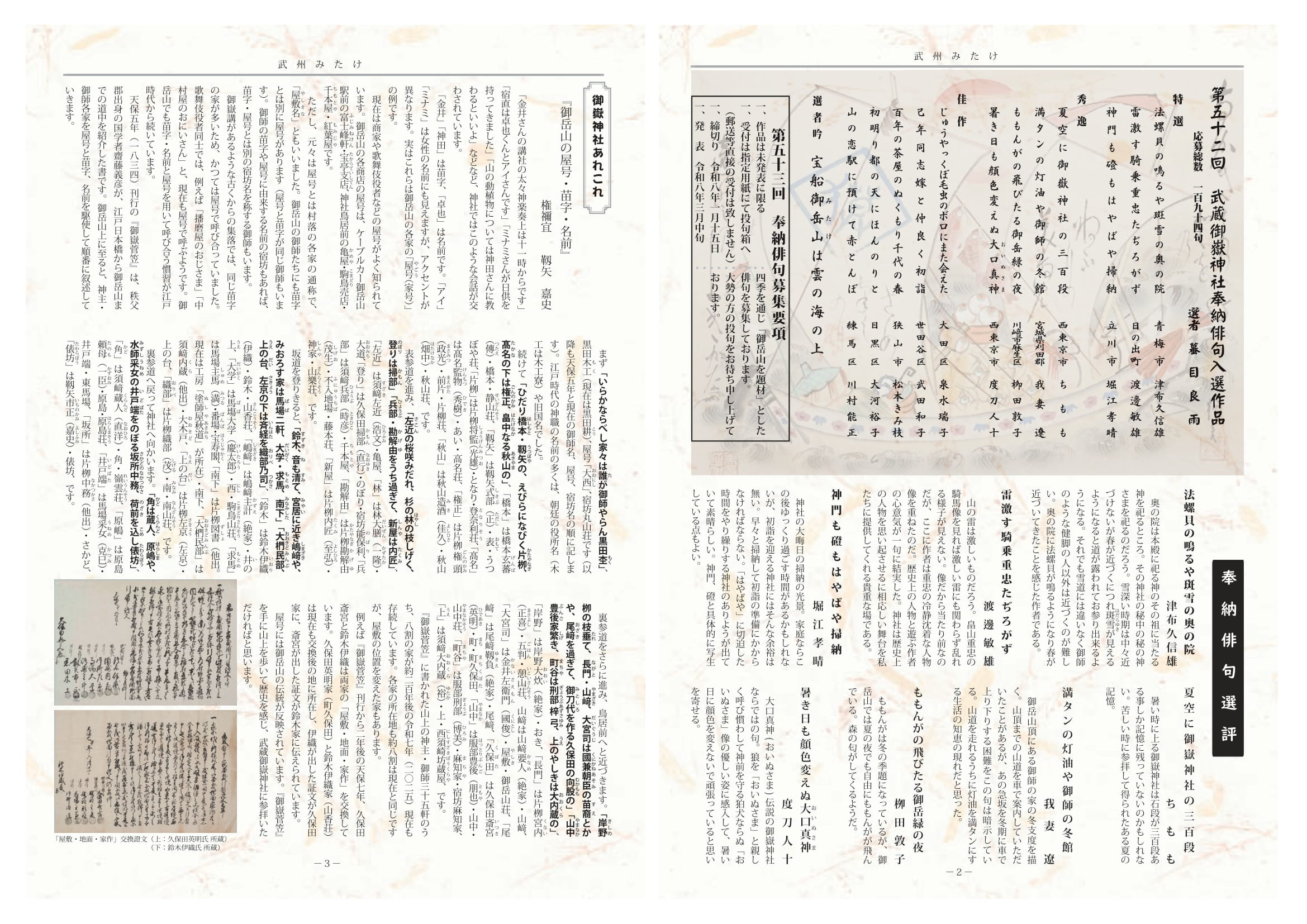 ・P.2 「第五十二回 武蔵御嶽神社奉納俳句入選作品」(選者 蟇目良雨)